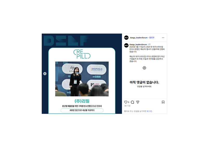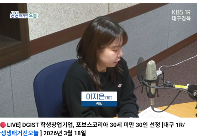 ㈜리필(Repill)의 이지은 대표가 최근 KBS대구 1라디오 「생생매거진, 오늘」에 인터뷰이로 참여해 창업 과정과 기업의 비전, 그리고 탄소포집 기술의 미래에 대해 직접 이야기를 전했다.이번 인터뷰는 Forbes Korea ‘30 Under 30’ 선정 이후 이어진 공식 대외 활동으로, 리필이 추구하는 분산형 탄소포집·자원화 기술과 창업 스토리를 보다 ..
