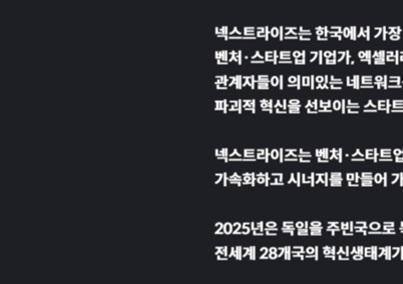 NextRise는 글로벌 스타트업, 대·중견기업 및 VC 등 벤처 생태계 구성원들의 축제입니다. 2025년은 독일을 주빈국으로 북미, 유럽, 아시아, 중동 등 전세계 28개국의 혁신생태계가 연결됩니다. 글로벌 스타트업, 대·중견기업 및 투자자(VC, PE, AC) 등 25,000명 이상이 모여 사업협력과 투자협력의 이야기를 나누고 새로운 기회를 발견합니..